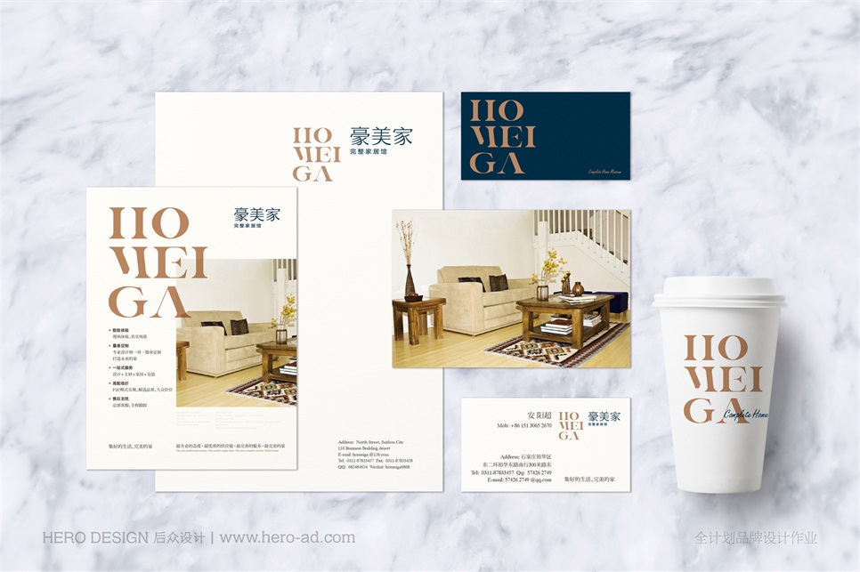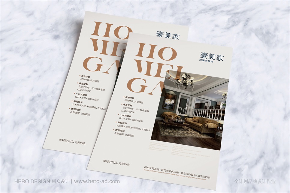 豪美家完整家居館是集一線家居建材精英品牌,全面提供高品質、高品位、高性價比服務,一站式完整家居配套選購平臺。豪美家整合上下游資源,貫通整個產業鏈,使各個環境完美銜接,提供真正一站式完整家居服務,為您打造精英階層高品質家居環境。后眾設計工作內容包括:品牌英文命名、品牌slogan錘煉、品牌標志形象設計、品牌宣傳物料設計、品牌環境設計。
