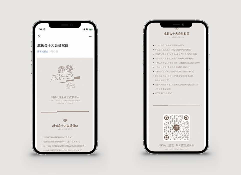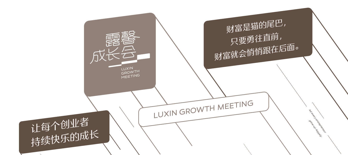 露馨成長會日常傳播物料基于創(chuàng)業(yè)者、成長的概念進行可視化設(shè)計,延續(xù)使用階梯的圖形化表現(xiàn),充分展示一個有助于會員奔赴成功的交流平臺的厚重、穩(wěn)健與持續(xù)輸出。